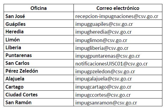 - Unidad de Impugnaciones de San José: San José, La Uruca, contiguo al Banco Nacional, Plataforma de Servicio al Usuario del Cosevi.